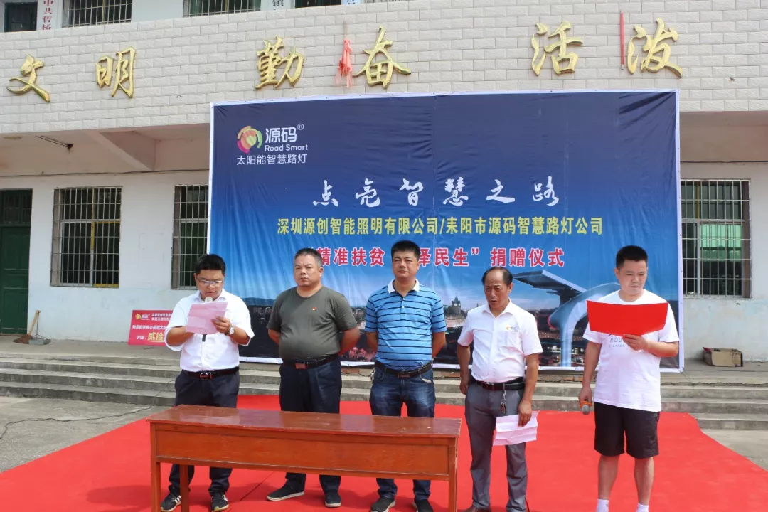 儀式現場,源碼王總和耒陽源碼周總向哲橋鎮紅星村與黎明村無償捐贈一批源碼太陽能智慧路燈,王總表示“源碼將始終肩負責任,在提供好產品的同時,懷著感恩的心,繼續用我們最大的努力為精準扶貧貢獻力量?!?/span>